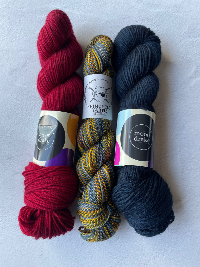 The Happy Camp Sweater is a seamless, top-down design that balances bold all-over colorwork with easy wearability. A ribbed collar and short-row shaping set up the yoke, where geometric motifs unfold in rhythmic repeats across the body and sleeves. Simple rounds in the main color give the eye (and the knitter) space to breathe.