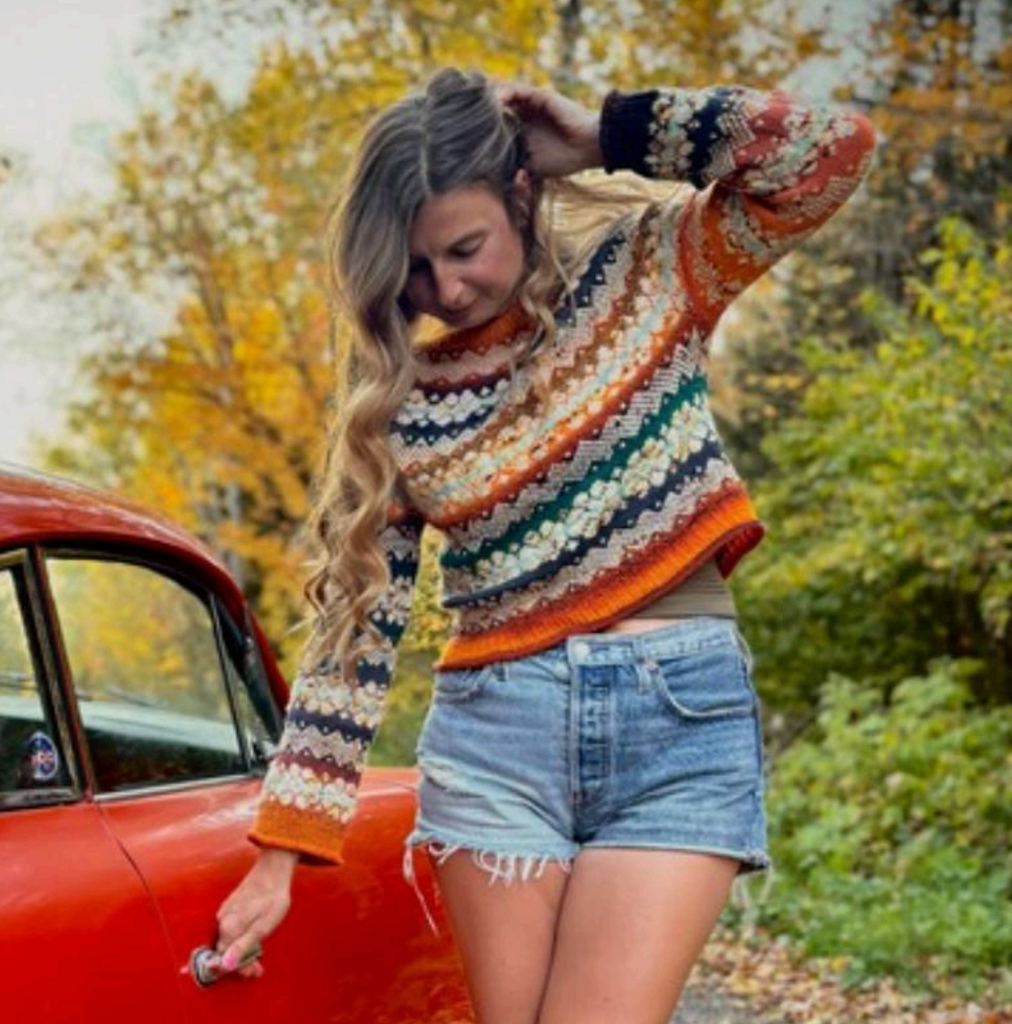 The straight body and relaxed rolled hems keep the silhouette casual and layer-friendly, while the sleeves taper gently toward ribbed cuffs for a polished finish. It’s a sweater designed for joyful knitting and everyday adventure — equally at home by the campfire or out in town.